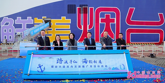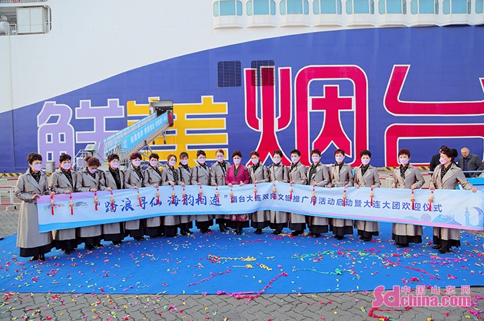中国山东网-感知山东3月28日讯 3月28日,伴随着阵阵鼓声,在欢乐和热闹的氛围中,“踏浪寻仙 海韵相连”烟台大连双向文旅推广月活动启动暨大连大团欢迎仪式拉开帷幕。烟台市文化和旅游局副局长任建平、大连市文化和旅游局副局长姜微,大连市旅行社分会会长王丽华、烟台市旅行社协会会长夏卫,渤海轮渡集团副总经理张志伟、新绎旅游烟台项目公司总经理凌云龙,以及相关企业代表、市民游客等200余人参加了现场活动。